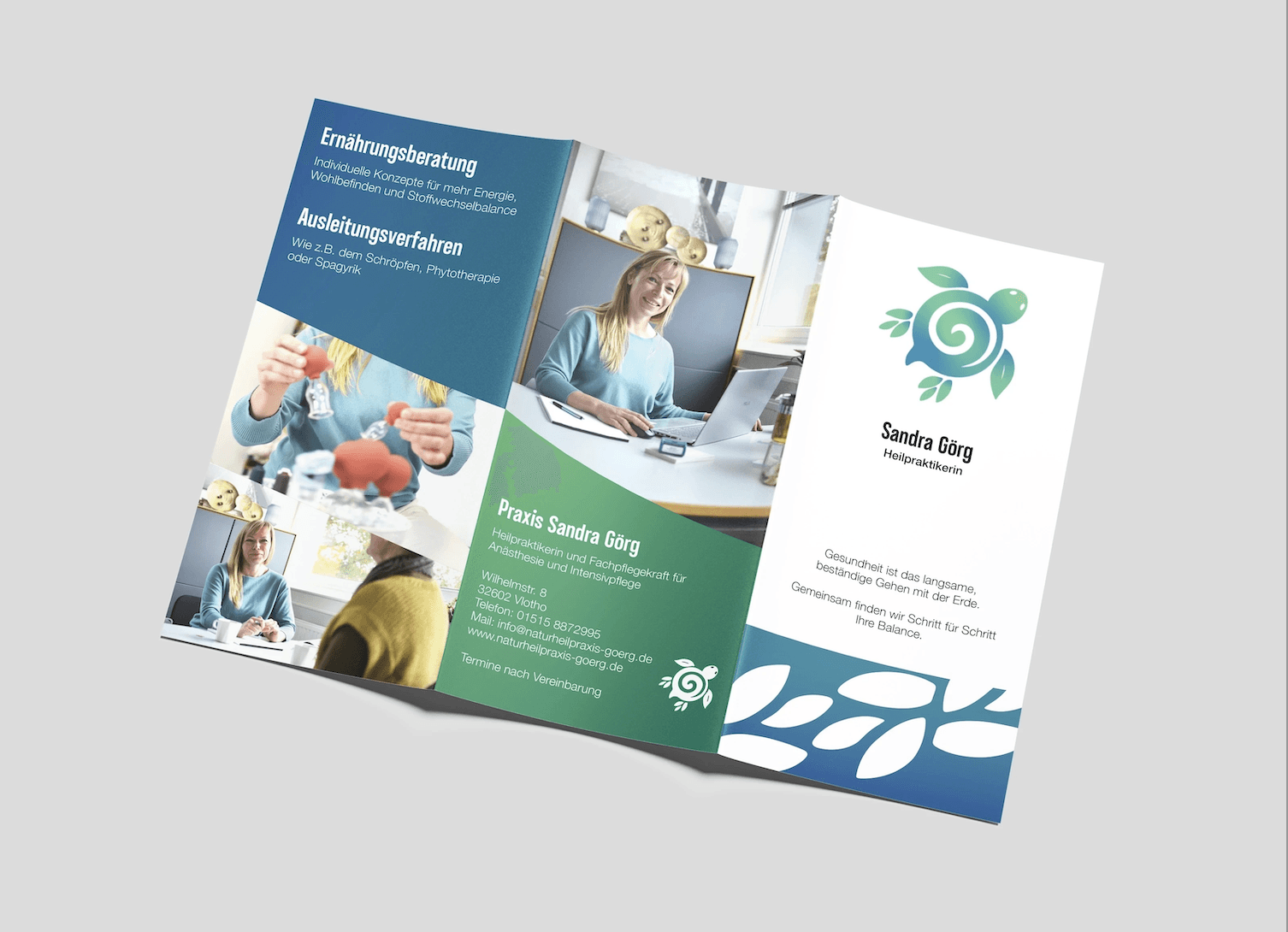When Sandra Görg, a Heilpraktikerin and former ICU nurse, decided to open her own naturopathic practice, she wanted a brochure that could introduce her services with warmth and authenticity. She needed a cohesive design that captured her compassionate, patient-centered approach. The final brochure blends clarity with emotional resonance—grounded in her philosophy of balance, connection, and gentle healing. I started by exploring how Sandra’s story and message could be expressed visually through composition, type, and color. Drawing inspiration from her logo, I built a complementary color palette and used gradients to mirror the organic transitions found in nature and in her treatments. The front cover features a custom path pattern derived from the turtle’s feet in her logo—a subtle symbol of her motto, “Health is the slow, steady walk with the Earth.” Thoughtful typography, human-centered imagery, and reconstructed icons all work together to communicate empathy, professionalism, and calm confidence.