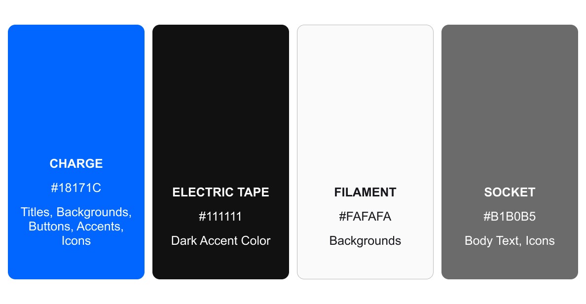 into a clean geometric mark. The diagonal cut on the bottom bar introduces forward momentum, while the overall form reads simultaneously as a stack, implying organization and order. Both readings are intentional, and both connect to the same brand idea. The color palette extends the language throughout the system. Charge, Electric Tape, Filament, and Socket, each named for the materials and mechanics of the lightbulb, form a cohesive system that is grounded, distinctive, and built to stand apart.