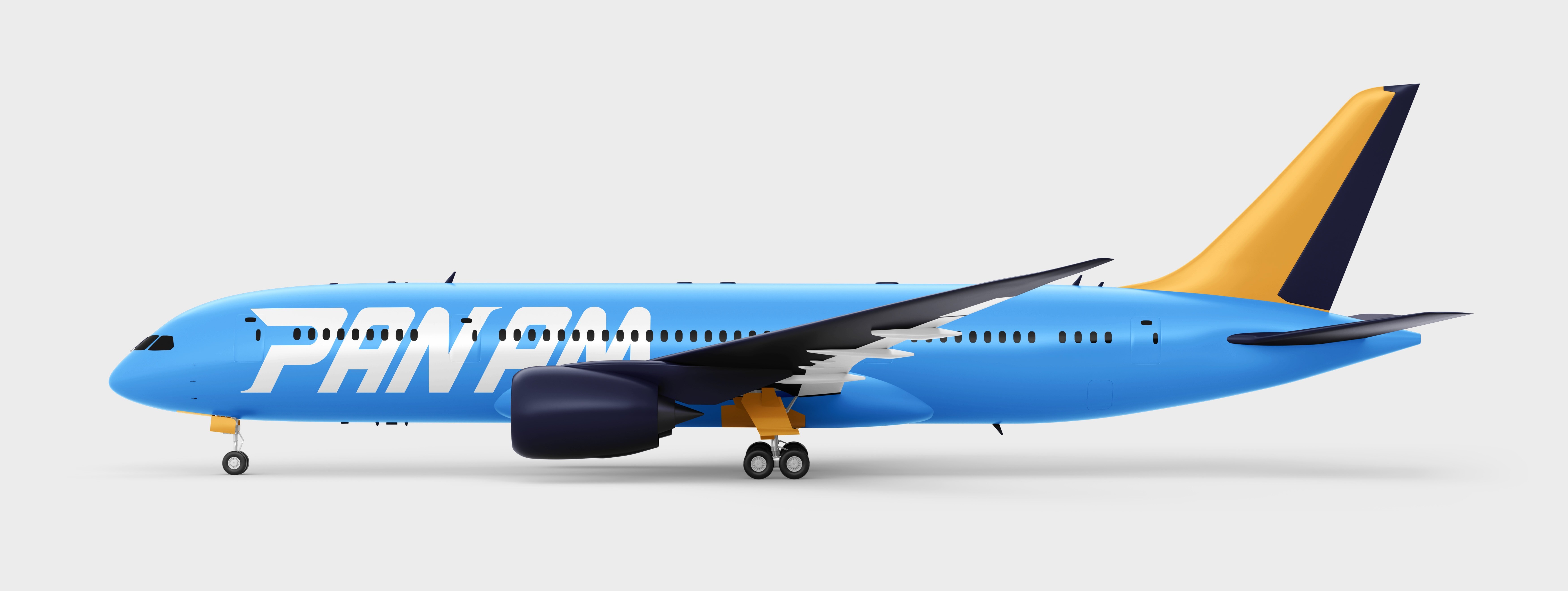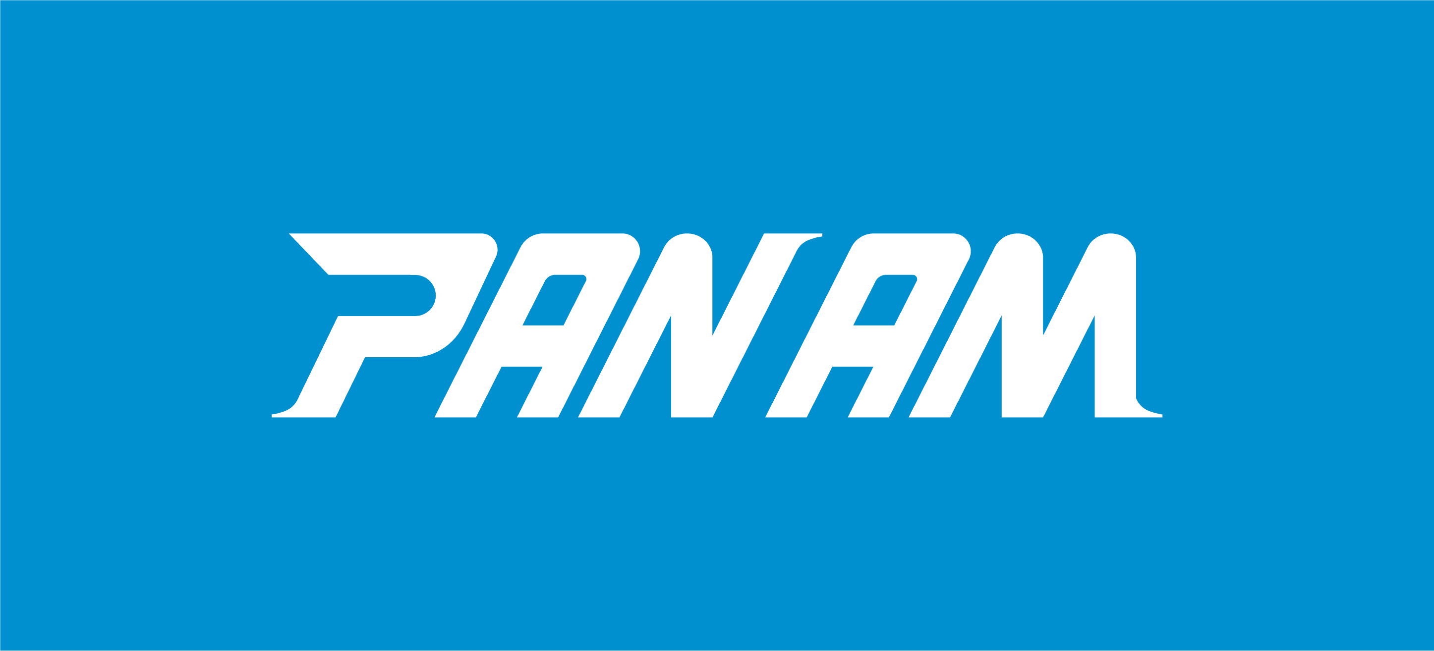 The new Pan Am logotype is custom and brings back the brand’s iconic optimism with a modern, energetic form. The “P” echoes the wing shape from the 1928 mark, now refined with clean geometry and a subtle aircraft silhouette flying in from the left. Extended letter legs preserve