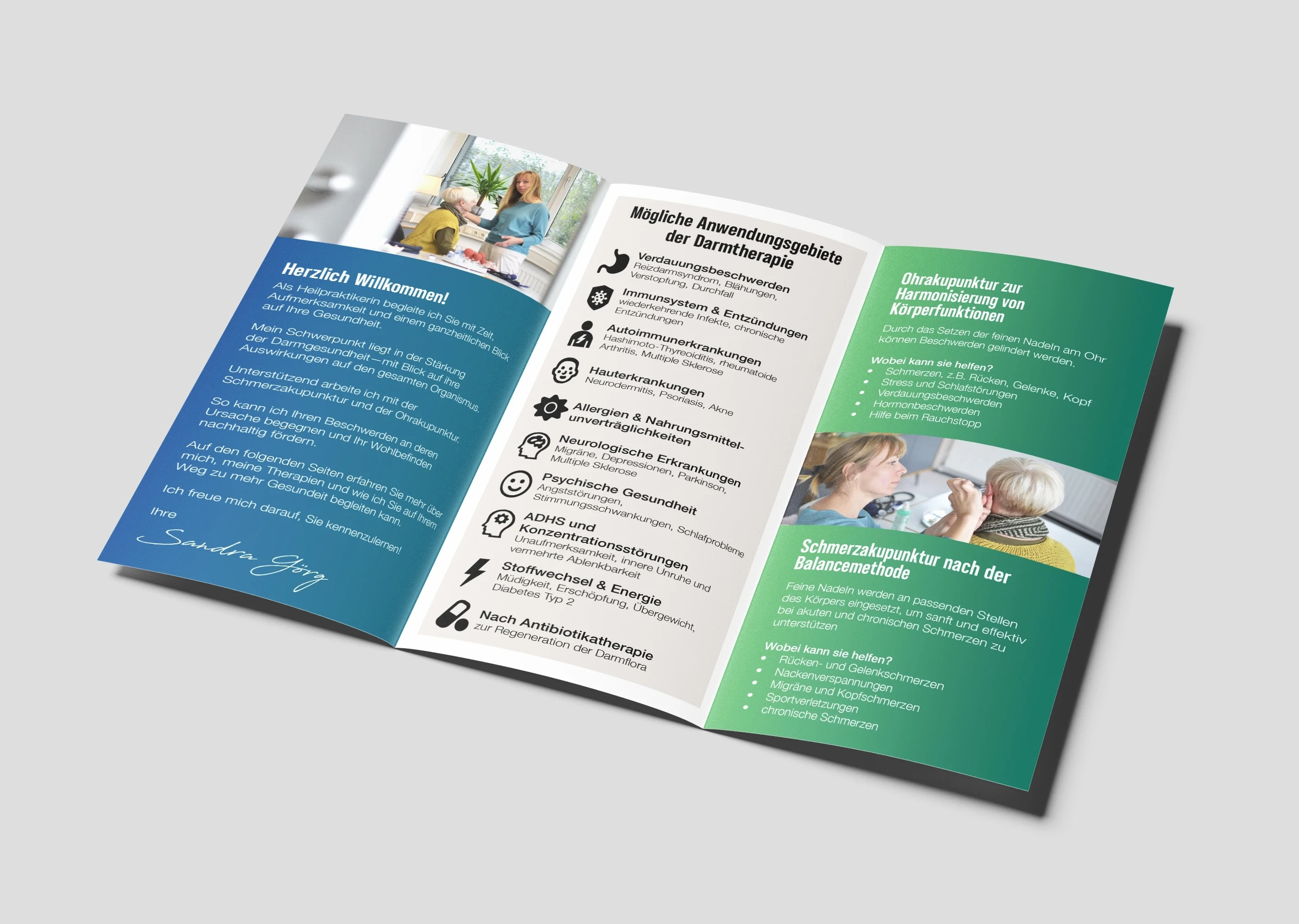 When Sandra Görg, a Heilpraktikerin and former ICU nurse, decided to open her own naturopathic practice, she wanted a brochure that could introduce her services with warmth and authenticity. She needed a cohesive design that captured her compassionate, patient-centered approach. The final brochure blends clarity with emotional resonance—grounded
